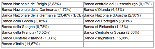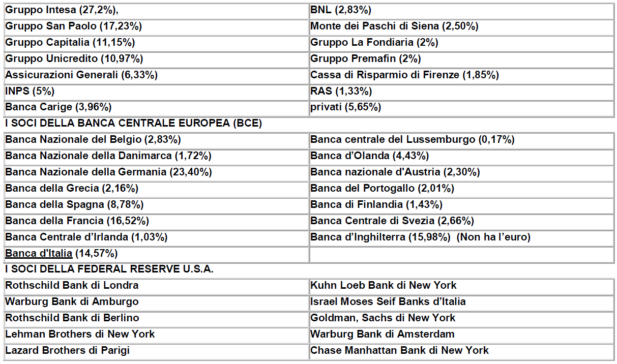 La BCE, con sede a Francoforte (è nelle mani di pochissimi banchieri) è la Banca Centrale che gestisce e controlla tutta l’emissione delle banconote in Europa. I proprietari della BCE sono le seguenti Banche Centrali: