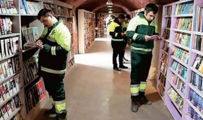 Approfittando di questa prima selezione dei rifiuti fatta dai cittadini, alcuni netturbini della città turca di Ankara hanno avuto un idea geniale. Hanno chiesto il peremesso ai propri padroni di mettere da parte ogni singolo libro in buono stato per crearne una biblioteca.