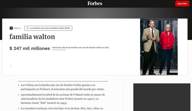 I Walton hanno un valore di circa 247 miliardi di dollari e fanno tangenti in contanti per dominare le piccole imprese. I Walton sono stati indagati per aver pagato tangenti in contanti all’indirizzo in Messico per assumere il controllo. Possiedono la Arvest Bank con Jim Walton e Sam Walton come soci principali.