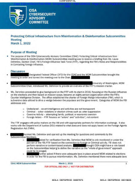 Tra i documenti ci sono i verbali di una riunione del 1° marzo del Comitato consultivo per la sicurezza informatica dell’Agenzia per la sicurezza delle infrastrutture e della cibersicurezza (CISA) del DHS, che ha il controllo generale della politica di disinformazione all’interno del Dipartimento.