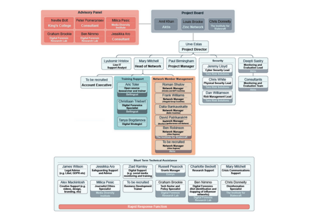 Il dottor Neville Bolt del Dipartimento di Studi sulla Guerra ha fatto parte del gruppo consultivo preliminare dell’organizzazione, insieme a Graham Brookie del Consiglio Atlantico (think tank della NATO) e Ben Nimo, ex direttore della ricerca di Graphika e attuale capo del servizio di intelligence di Facebook. Nel frattempo, il personale di Bellingcat fornirà un supporto formativo.