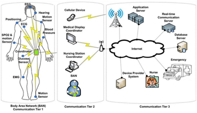 A tal fine, è prevista la realizzazione di una rete di nanocomunicazioni per nanosensori, nota anche con l’acronimo WNSN (Wireless Nanosensors Networks o WBAN, vedi sopra). Secondo i ricercatori, una rete di questo tipo ha bisogno di antenne di dimensioni nanometriche, che operino con antenne compatibili nella gamma dei Tera Hertz (onde elettromagnetiche), in grado di propagare il segnale in modo efficiente, senza perdite. In questo modo, i nano-sensori sono interconnessi nella rete wireless per un’azione coordinata, trasmettendo i dati a un nodo gateway, che potrebbe essere un telefono cellulare o una qualsiasi antenna telefonica, che invierebbe automaticamente le informazioni all’ospedale via Internet.