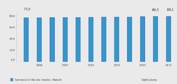 Quella sotto è una tabella dell’Istat, relativa alla aspettativa di vita alla nascita dei maschi italiani. Dal 2004 al 2015, in 11 anni, l’aspettativa di vita alla nascita è aumentata di 2 anni e 2 mesi.