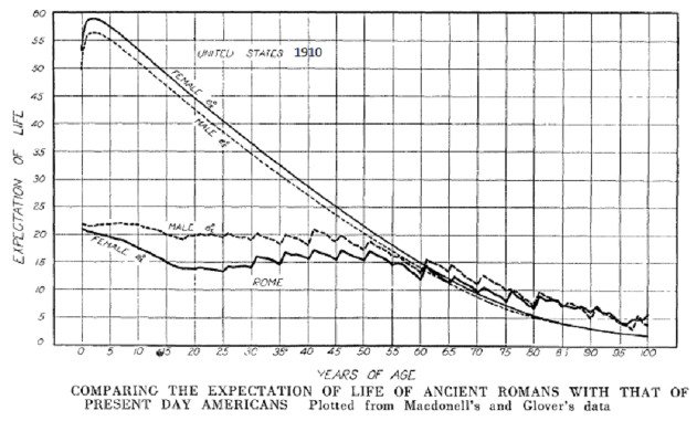 Si può vedere chiaramente che, se è vero che alla nascita la speranza di vita di un Romano di 2.000 anni fa era solo di poco più di 20 anni, già all’età di 60 anni aveva la stessa speranza di vita di un americano del 1910 (dal 1910 i dati non sono cambiati di molto) e da lì in poi la sua aspettativa di vita era addirittura superiore, avendo cioè più probabilità di arrivare a 100 anni di quanto non abbiamo noi al giorno d’oggi.