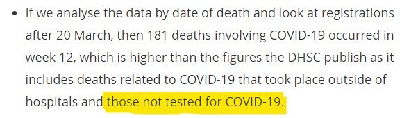 L’ufficio nazionale di statistica della NHS in Inghilterra pubblica rapporti settimanali sulla mortalità nazionale. Il suo ultimo rapporto (Settimana 12 – 14-20 marzo) e’ stato rilasciato il 31 marzo e ha fatto menzione speciale di Covid19, spiegando che avrebbero modificato il modo in cui avrebbero riportato i numeri in futuro .