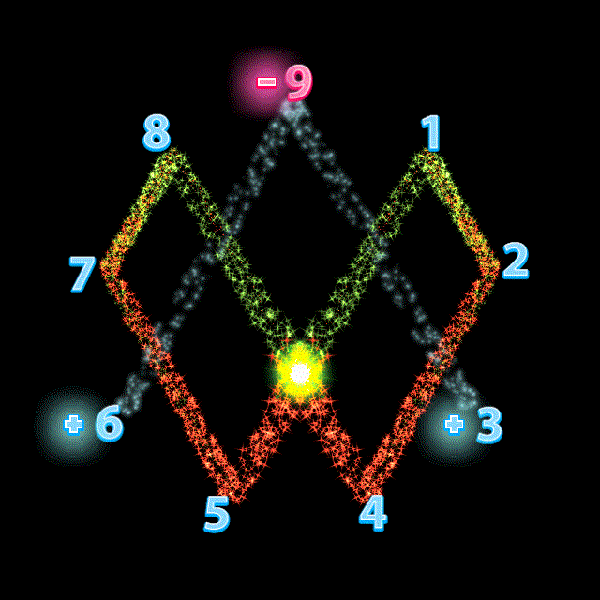 Si noti che 3, 6 e 9 non rientrano in questo schema. Lo scienziato Marko Rodin (scopritore della matematica dei vortici) ritiene che questi numeri rappresentino un vettore dalla terza alla quarta dimensione che chiama “campo di flusso”. Si suppone che questo campo sia energia dimensionale superiore che influenza il circuito energetico degli altri sei punti (1, 2, 4, 5, 7, 8).