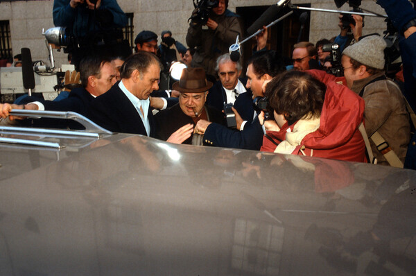Paul Castellano, boss della famiglia criminale Gambino, viene fotografato mentre arriva al processo il 27 febbraio 1985 presso la U.S. Federal Courthouse di Manhattan, New York City.