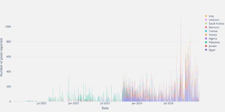 Ogni segnalazione è associata al Paese di origine del post. A differenza di altri Paesi, i dati mostrano che Israele si è concentrato sui post provenienti dai Paesi limitrofi, come Egitto, Giordania, Palestina, Algeria e Yemen. Questi pochi Paesi confinanti hanno costituito ben il 69% delle segnalazioni. Le segnalazioni israeliane relative a post provenienti dagli Stati Uniti hanno contribuito solo allo 0,7% del volume totale delle segnalazioni.
