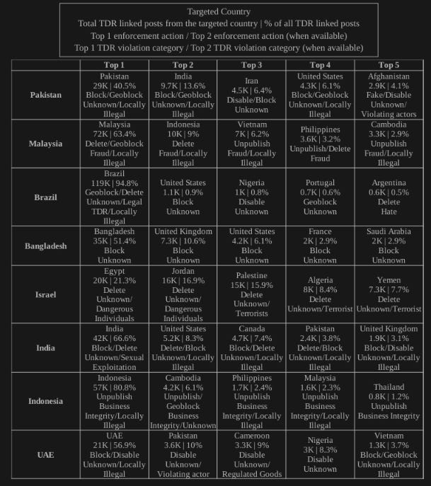 Sebbene Israele abbia il maggior numero di richieste di rimozione pro capite, anche altri governi inviano un numero elevato di segnalazioni, tra cui Pakistan, Malesia, Brasile, Bangladesh, India, Indonesia ed Emirati Arabi Uniti.
