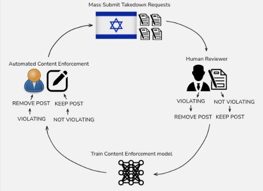 Rapporti governativi privilegiati e di grande volume —> Approvazione umana rapida —> Riqualificazione dell’IA —> IA ottimizzata per censurare contenuti simili