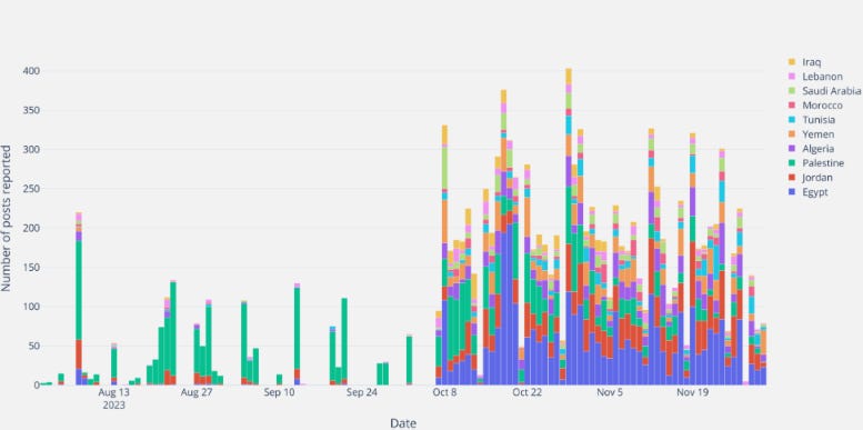 Ingrandendo l’immagine, possiamo vedere come l’attività abbia registrato un aumento dopo il 7 ottobre e come l’attenzione si sia spostata dalla Palestina alla regione circostante. Da notare anche il calo delle segnalazioni ogni sette giorni, in coincidenza con lo Shabbat.
