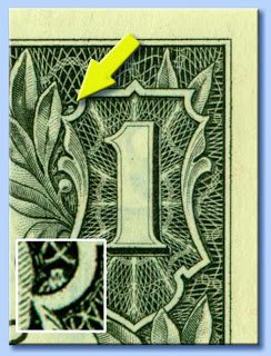 Un altro simbolo occulto che non si nota è la “Civetta Pagana”, nell’angolo superiore destro, nella parte superiore sinistra della cornice che circonda il numero “1”. E’ una minuscola civetta (da vedere con la lente di ingrandimento) ed è il simbolo del dio pagano Moloch, associata a pratiche occulte e alla ricerca di un sapere esoterico.
