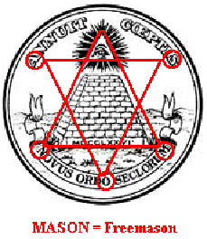La scritta “The Great Seal” (Il Grande Suggello) non è comprensibile, in quanto il simbolo dell’America è l’Aquila (sul fregio di sinistra), ma diventa subito chiaro se si considera che la piramide è anche un simbolo degli Illuminati. Nelle iscrizioni “Annuit Coeptis” e “Novus Ordo Seclorum”, se si traccia una linea dalla M di Seclorum alla A di Annuit alla O di Ordo alla S di Coptis e alla N di Novus, comparirà l’anagramma di “mason” (massone) e il pentagramma demoniaco detto “Testa di capra”, lo stesso inserito nella pianta stradale di Washington D. C. Questa stella, con una punta in basso e due in alto è il simbolo del male (Satana), e nei riti satanici è utilizzato per evocare le potenze malefiche.