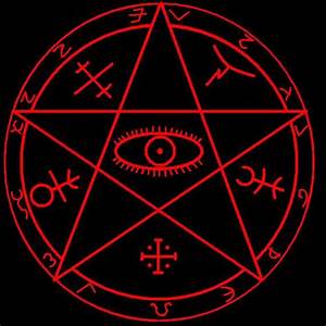 Un altro simbolo satanico che compare è l’esagramma massonico, la stella a sei punte, frutto della combinazione fra il “Triangolo di Terra” e il “Triangolo d’Acqua”. Nella massoneria va sotto il nome di Sigillo di Salomone e secondo i massoni rappresenta l’armonia (un concetto che ricorda lo yin e lo yang). Da non confondere con la Stella di David, perchè nel simbolo massonico i triangoli si intersecano. Nell’esagramma vi sono connotazioni sessuali: il Triangolo d’Acqua è un simbolo femminile, mentre il Triangolo di Terra, con la punta all’insù, rappresenta il maschile. L’intreccio fra i due triangoli rappresenta l’unione delle forze attive e passive presenti in natura (maschile e femminile). L’aspetto più importante, però, è che l’esagramma viene largamente associato all’occulto ed è considerato il più potente fra i simboli satanici, quello che racchiude il “666”. Gli occultisti lo chiamano anche “trud” e se ne servono durante le cerimonie di negromanzia per evocare gli spiriti del male.