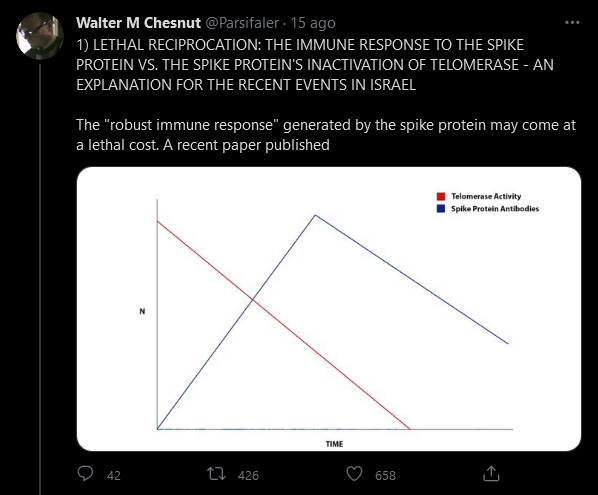 Chesnut ha scoperto, dopo aver esaminato uno studio scientifico peer-reviewed e una conferenza informativa, che una volta che le proteine del picco del vaccino si stabiliscono davvero e iniziano a fare ciò che sono state progettate per fare, la telomerasi di una persona iniettata diventa inattiva.