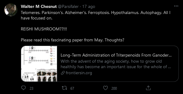 In un tweet più recente su come le persone possono affrontare la distruzione dei telomeri indotta dai vaccini, che è associata alla malattia di Alzheimer, Parkinson, ferroptosi, ipotalamo e autofagia, Chesnut ha twittato un link a un documento sul fungo reishi – vedi sotto: