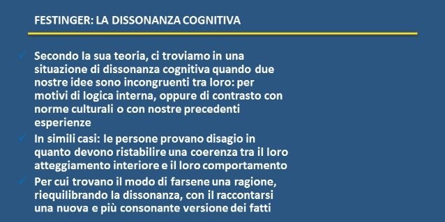 La dissonanza cognitiva e’ un tema che non viene mai affrontato, la parola evoca un conflitto che e’ sempre appannaggio degli altri ma che coinvolge tutti, indistintamente, indipendentemente dal luogo, l’eta’ e dalla cultura generale di ognuno.
