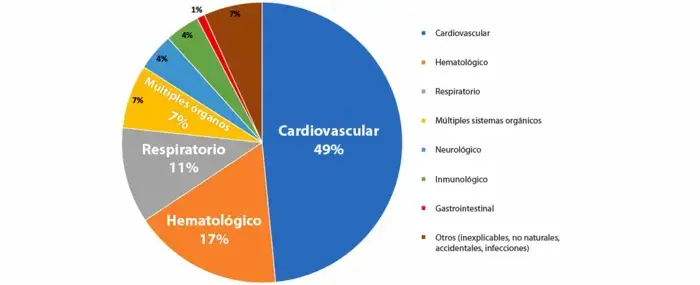 Le principali cause di morte includono la morte cardiaca improvvisa, che si è verificata nel 35% dei casi, l’embolia polmonare e l’infarto miocardico, che si sono verificati rispettivamente nel 12,5% e nel 12% dei casi.