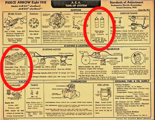 Le bobine di accensione esistevano anche negli anni Trenta. Sappiamo che sulla Pierce Arrow era installata una bobina di accensione prima che venisse trasformata in un’auto a motore elettrico. Il manuale di messa a punto indicava che la bobina di accensione della Pierce Arrow del 1931 era una bobina Delco-Remy 526-B. Il manuale di messa a punto della Pierce Arrow indicava anche che era montata sul cruscotto. Anche un cavo della batteria da 12 volt entra nel cruscotto ed è collegato all’interruttore di accensione.