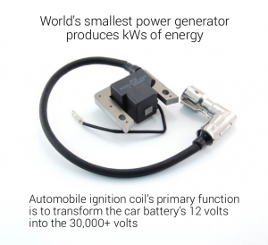 Allora, cosa ha usato Nikola Tesla, inventore del generatore di corrente alternata, per alimentare la Pierce Arrow del 1931? Ve l’ho appena detto. Nikola Tesla usava un generatore, un generatore molto compatto e portatile. Un generatore che non aveva parti in movimento. La funzione principale di quel piccolissimo generatore era quella di trasformare la bassa tensione in una tensione più che sufficiente per alimentare il motore elettrico brushless da 80 cavalli. Quale componente del motore a combustione di gas prodotto in serie svolge la stessa identica funzione? Una bobina di accensione, detta anche bobina di scintilla.