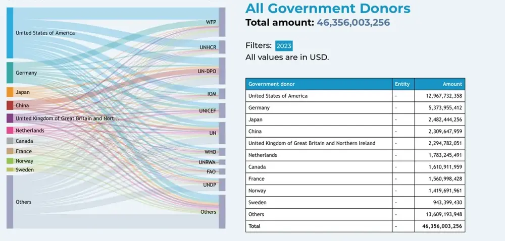 Sebbene l’ONU sia esente da imposte, i contribuenti di tutti i 193 Stati membri contribuiscono al suo finanziamento. Nel 2023, i governi hanno inviato più di 46 miliardi di dollari in contributi valutati, volontari e di altro tipo alle Nazioni Unite, con gli Stati Uniti (il maggior contribuente) che hanno inviato quasi 13 miliardi di dollari.