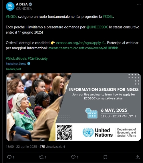 Lo status consultivo presso il Consiglio economico e sociale consente alle organizzazioni non governative (ONG) di accedere non solo all’ECOSOC, ma anche ai suoi numerosi organi sussidiari, ai vari meccanismi per i diritti umani delle Nazioni Unite e agli eventi speciali organizzati dal Presidente dell’Assemblea generale. Esistono tre tipi di status consultivo dell’ECOSOC per le ONG. Ad aprile 2021, 5.593 ONG godevano dello status consultivo attivo presso l’ECOSOC”.